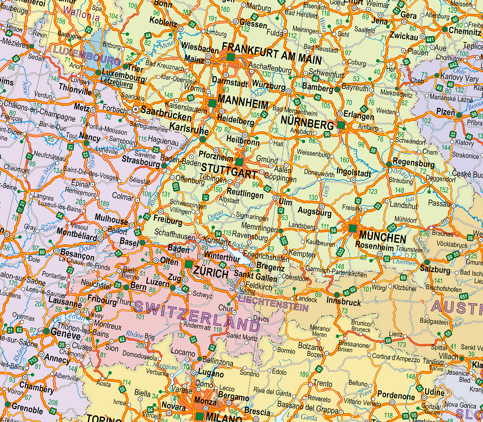 Map pictures information about road networks, road numbers in Europe, and distances. Also, routes of ferry lines have been updated.