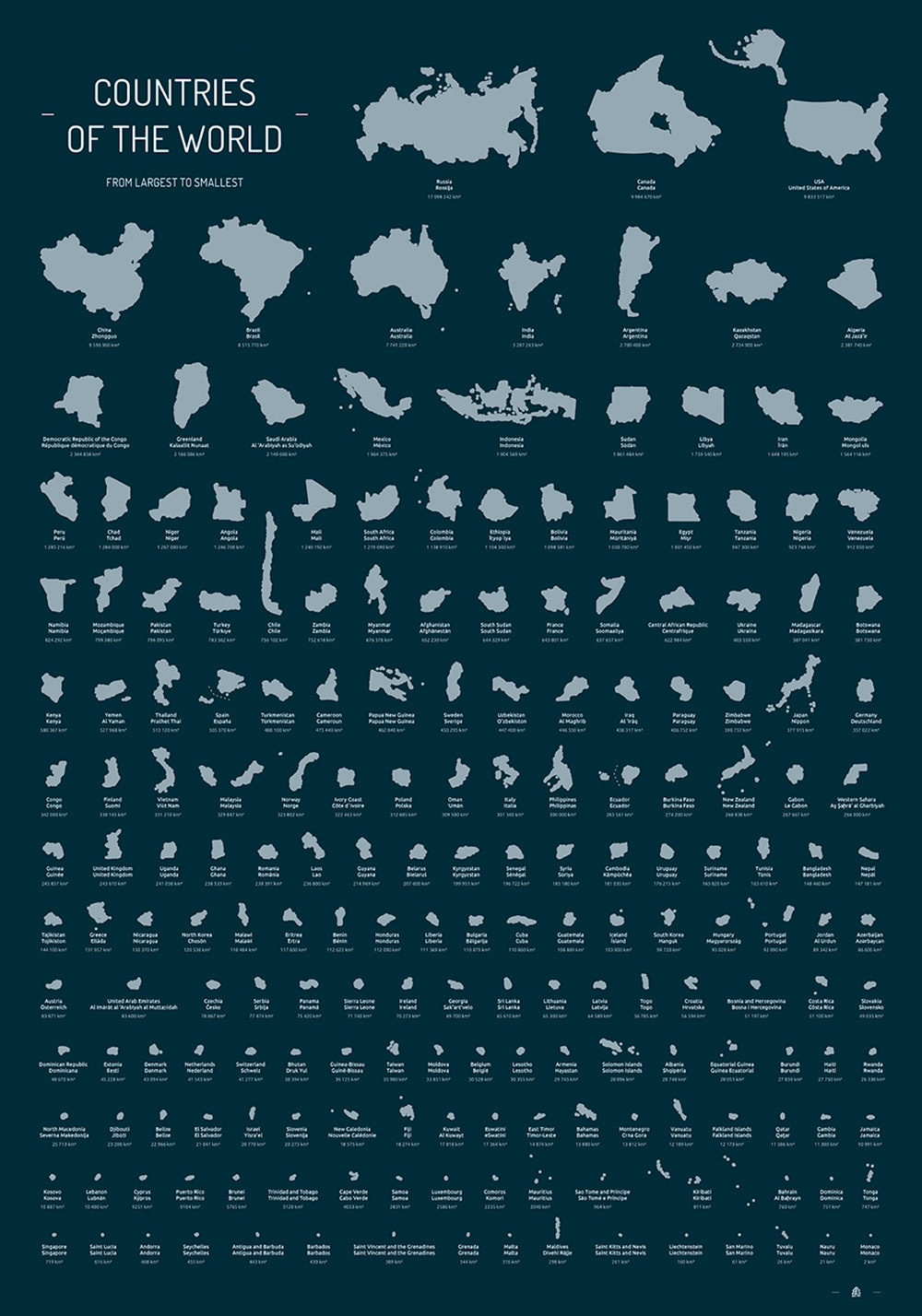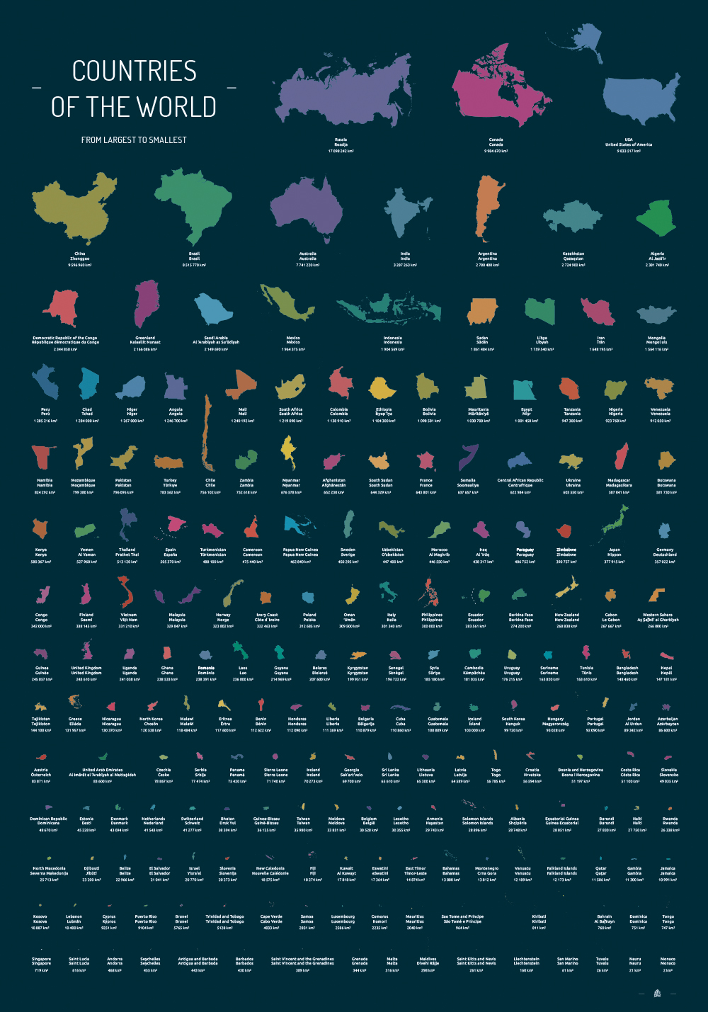 Nutrinamame plakate „Pasaulio šalys“ yra 200 šalių, vaizduojamų nuo didžiausios iki mažiausios. Prie kiekvienos šalies nurodytas jos pavadinimas originalo ir anglų kalbomis, taip pat teritorijos dydis.