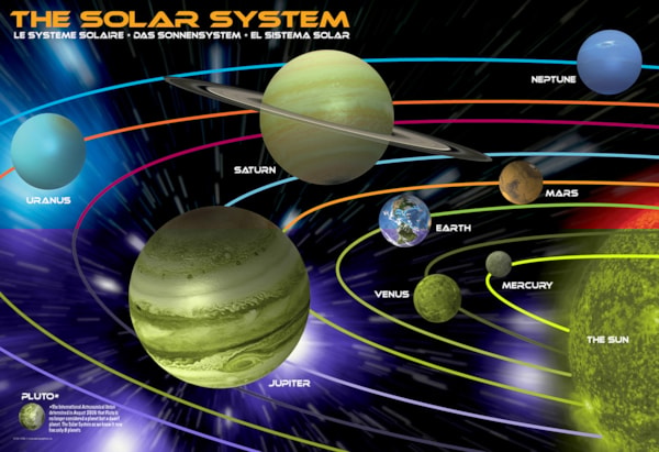 This vibrant jigsaw puzzle beautifully illustrates our celestial neighborhood, featuring the sun and all eight planets in their orbits. Each planet is clearly labeled, providing an engaging and educational experience as you assemble this stunning astronomical display.