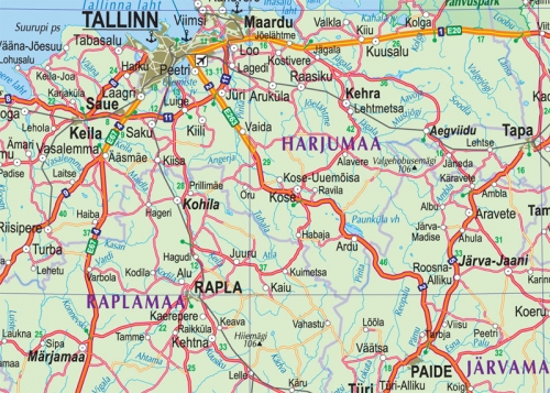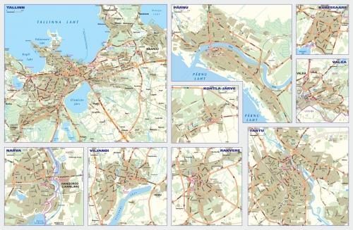 Igaunijas autoceļu karte mērogā 1:1 000 000 ar Tallinas (mērogs 1:100 000), Kohtla-Jerves, Kuresāres, Narvas, Pērnavas, Rakveres, Tartu, Valgas un Vīlandes (mērogs 1:50 000) pilsētu plāniem.