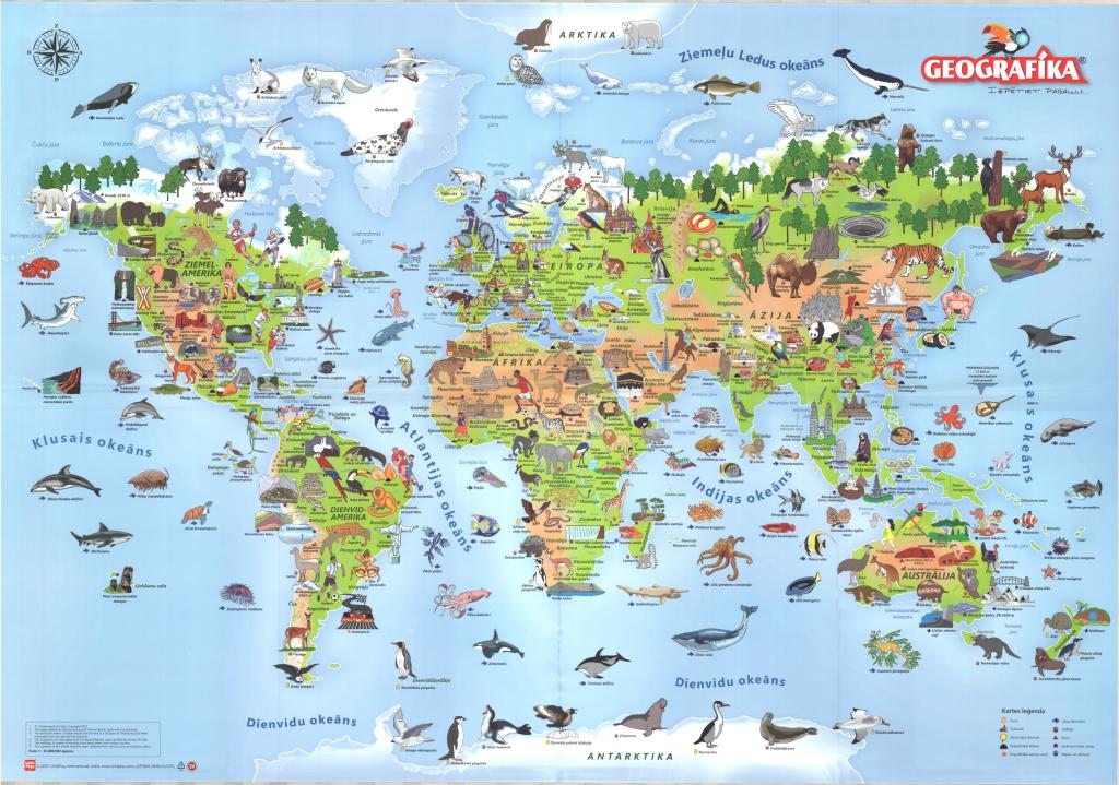 Karte “Geografika” ir viegls veids, kā mācīt bērniem par pasauli, kurā dzīvojam, ar vairāk kā 280 zīmētu ilustrāciju palīdzību. Kartē iekļautas valstu, upju, ezeru, okeānu, jūru, zīdītāju, rāpuļu, abinieku, putnu, jūras dzīvnieku, slavenu vietu, festivālu, pārtikas produktu, sporta veidu u.c. ilustrācijas.
